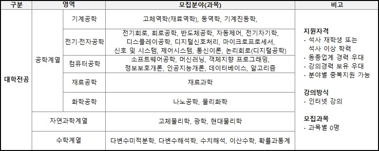 안녕하세요, 유니스터디(UNISTUDY) 입니다. 유니스터디는 메가스터디교육그룹이 운영하는 대학전공 전문 온라인 강의 플랫폼으로, 대학생들의 전공 기초부터 심화학습까지 폭넓게 지원하는 다양한 전공 강의를 구축하고 있습니다. 대학 교육에서 상대적으로 부족한 기초·심화·전문 전공과목을 온라인 강의로 제공하며, B2C(대학생 대상 서비스)뿐 아니라 대학 및 기업과의 B2U·B2B 교육 제휴를 통해 맞춤형 학습 콘텐츠도 함께 운영하고 있습니다. 전공 교육의 가치를 함께 만들어갈 전문성과 열정을 갖춘 강사님의 많은 지원을 기다립니다. # 상세채용분야 및 인원 - 대학전공 강의 ![]() ※ 상기 모집분야(과목) 외에도 다양한 대학전공 과목에 대해 채용을 진행하오니 많은 지원 부탁드립니다. ※ 평생교육원 학점은행제 과정이 아닌 대학전공 온라인 강의입니다. ※ 자사 사이트에서 제공중인 강의 콘텐츠 확인 후 지원 부탁드립니다. # 제출서류내용 - 국문 이력서 / 자기소개서(강의경력 중심) - 서류 제출시 > 서류 제출시 본인이 지원하는 영역(공학계열(기계공학/전기·전자공학/컴퓨터공학/재료공학/화학공학), 자연과학계열, 수학계열 중 택 1) / 과목 반드시 기입 - 기존 촬영하신 동영상 강의 영상 제출 시 카메라 테스트(시범강의) 면제 # 지원자격 - 전공별 석사 재학생 또는 석사 이상 학력 소유자 - 강의교안(PPT) 제작 가능한 자 - 문항출제 및 강의경력 + 인강 경험자 우대 - 다양한 강의 가능 과목을 보유할 경우 우대 # 급여조건 - 회사 내규에 따르며 협의에 의해 조정 가능 # 전형방법 - 1차 서류전형 > 2차 실무면접(카메라 테스트) > 3차 임원/심층면접 > 합격 ㄴ 3차 심층면접은 일정에 따라 조정 가능 ㄴ 기존 촬영분 제출 시 카메라 테스트는 면제 # 지원방법 - 메가스터디교육그룹 채용 홈페이지를 통해 지원 # 기타 - 제출한 이력서/경력 등이 사실이 아닐 경우 채용이 취소될 수 있음 - 합격자에 한해 개별 연락 예정(불합격자 대상 별도 연락 없음) |