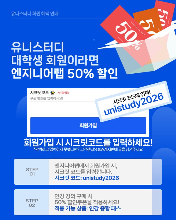 게시판 글보기 구분 안내 제목 [유니스터디X엔지니어랩] 대학생 회원 할인 혜택 안내 등록일 2026-02-09 조회수 1413 ▶▶▶ 엔지니어랩 바로가기 목록 다음글 2026년 설 연휴 교재 배송, 기기 배송 및 학습지원센터 운영 안내 이전글 예비대학생 웰컴 이벤트(2차) 당첨자 발표