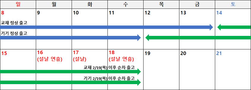 안녕하세요, 유니스터디입니다. 1. 교재 배송 안내 2월 13일(금) 오후 5시 30분까지 교재를 구매(결제 및 입금완료)하시면 설 연휴 전에 출고되어, 빠르게 받아 보실 수 있습니다. 2월 13일(금) 오후 5시 30분 이후 주문하신 교재는 2026년 2월 18일(수)부터 발송을 시작하며, 이후 택배사 일정에 따라 순차적으로 발송됩니다. 2. 기기 배송 안내 2월 11일(수) 자정까지 기기를 구매(결제 및 입금완료)하시면 설 연휴 전에 출고되어, 빠르게 받아 보실 수 있습니다.