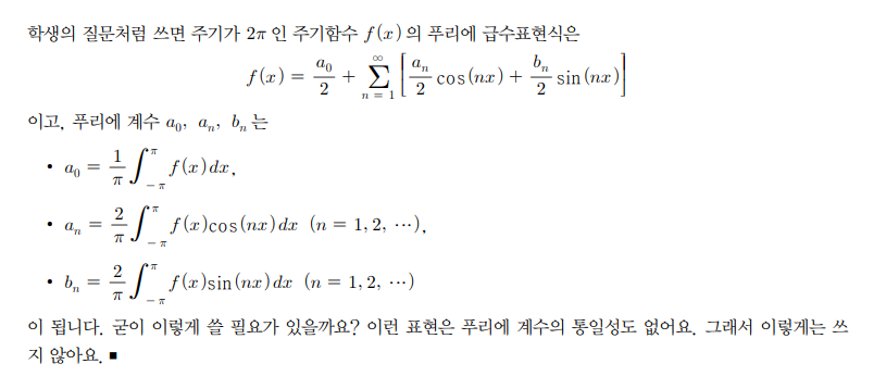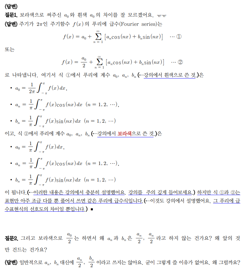 보라색으로 써주신 a 0 와 흰색 a 0 의 차이를 잘 모르겠어요 ㅠㅠ 그리고 보라색으로 a 0 /2 는 하면서 왜 a n 과 b n 은 a n /2, b n /2 라고 하지 않는 건가요? 왜 앞의 것만 건드는 건가요?