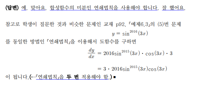 만약 sin^2016(x)를 미분한다고하면 2016sin^2015(x)에서 합성함수 법칙을 써서 sin미분하명 cos이니까 답이 2016sin^2015(x)cos(x)인가요? 답변 완료된 질문과 답변은 수정 및 삭제가 불가합니다. |