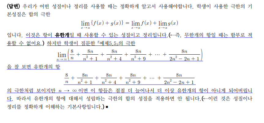 극한의 기본성질에 의해 모든 항이 각각 0으로 수렴하게 되어 모든 합이 0이 된다고 생각하는 건 어디가 틀린 건가요?