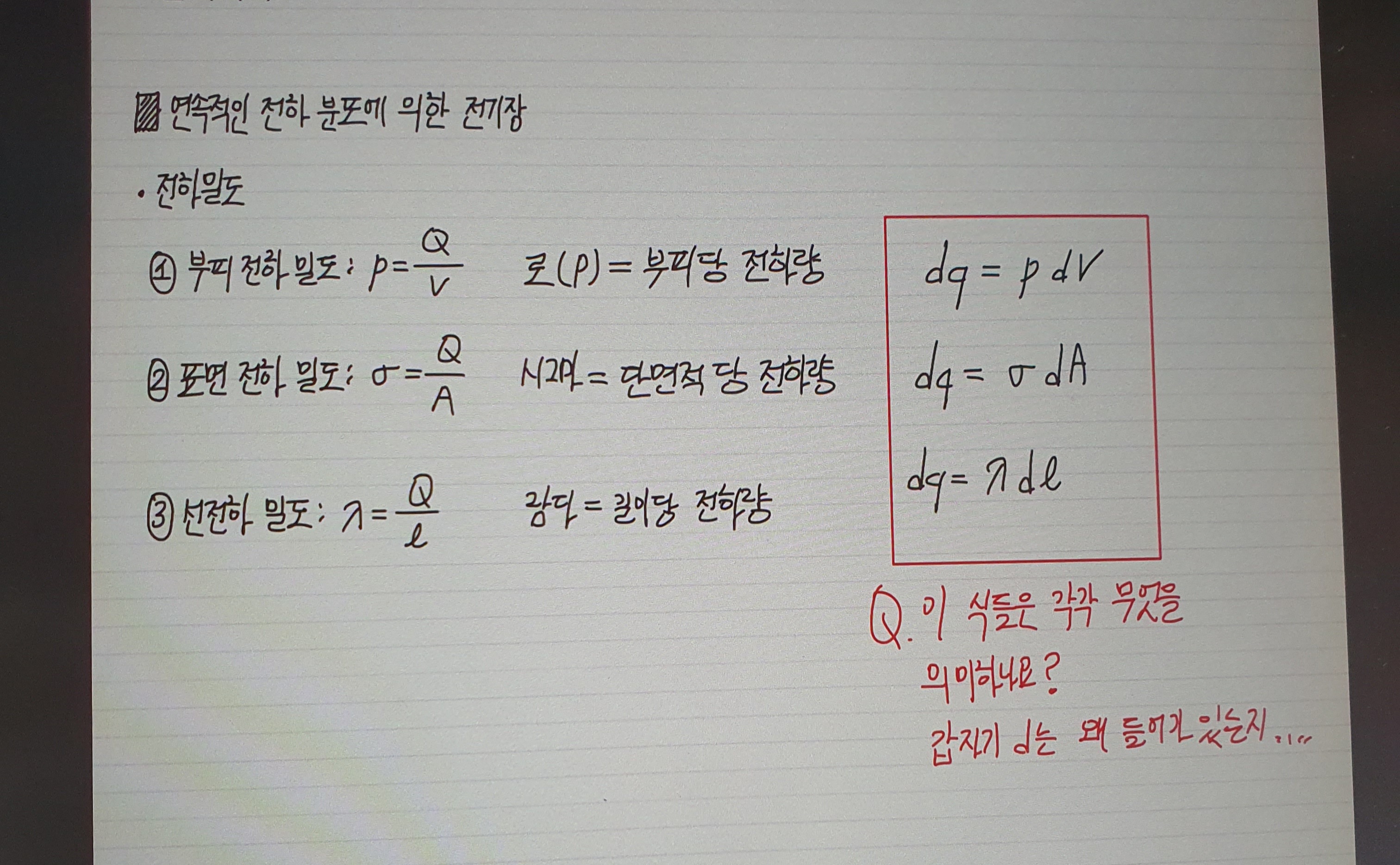 이때, 이를 가우스 법칙이나, 앙페르 법칙 등과 같이 대칭성을 고려해야 하는 경우에...전하밀도와 길이, 또는 면적, 또는..부피를 통해 전하량을 계산할 수 있습니다.