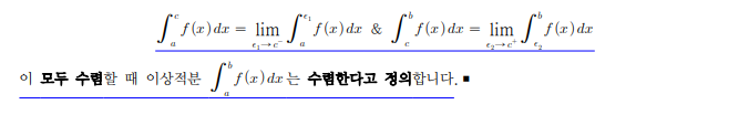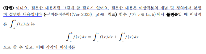 보기 다 번인데, 교수님이 이전에 풀어주신 방식대로 구간 (0,1)도 계산해봤는데 똑같이 발산이 나옵니다. 그런데 적분 결과가 둘 다 발산이면 서로 상쇄되어 수렴이 되는지도 체크해야 하는 것 아닌가요? (제 계산으로는 구간 0,1의 적분 결과는 음의 발산이 나왔습니다)