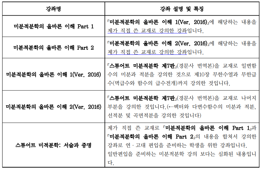 4. 기초 미적분학을 다 학습한 상태에서 첫 단계로 들어야하는 미분적분학 수업으로 그냥 2023 버전의 미분적분학 1,2 를 수강하면 되는 것인지 문의드립니다