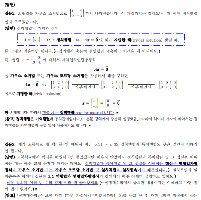제가 고등학교 때 백터를 안배워서 지금 p.31 ~ p.32 정칙행렬과 특이행렬도 무슨 말인지 이해가 안됩니다. 답변 완료된 질문과 답변은 수정 및 삭제가 불가합니다. |