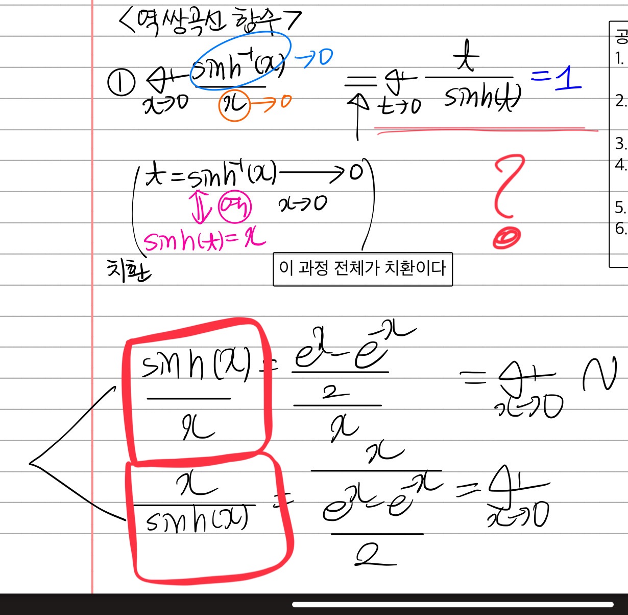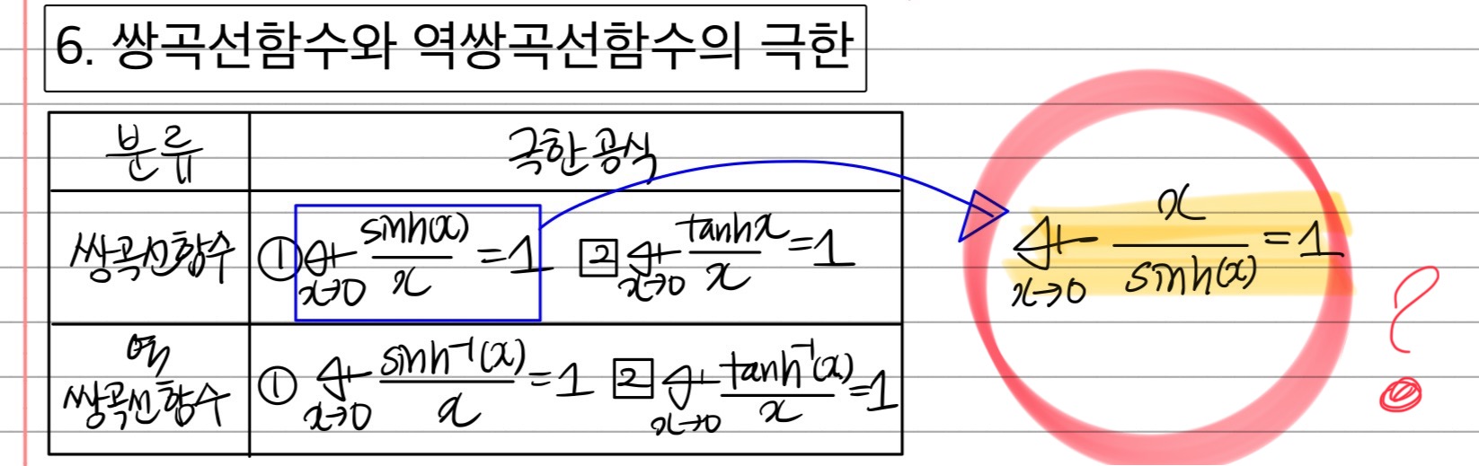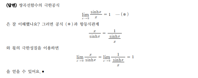 미분적분학 1 기초 ver.2023 2 함수의 극한과 연속 6.쌍곡선함수와 역쌍곡선함수의 극한 공식 1번 증명에서 p63