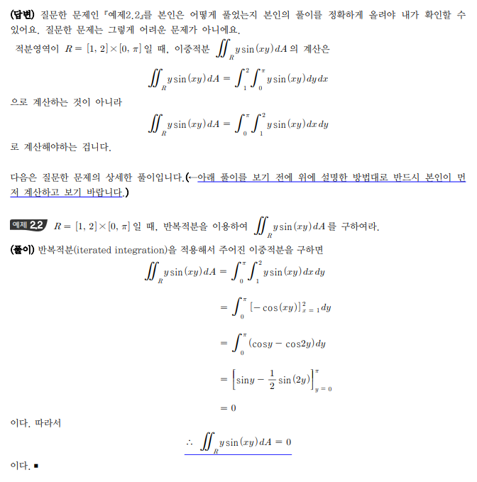 | 제목 | 답변완료 [미적분학] 미적분학의 올바른이해2/8단원 이중적분/7pg 예제 2.2 질문입니다 | ||