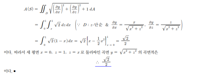 풀이를 편하게 하기 위해서 원래 f(x,y)에 대해 이중적분을 하지만 문제의 특성상 y가 공식의 z역할을 하기에 곡면 식을 루트(라운드y/라운드x의 제곱 더하기 라운드 y/라운드z의 제곱 더하기 1 형태로 바꿔 문제풀이를 했습니다 그런데 공식 대로 z에대해 미분하는 방식으로 접근하는게 접근이 잘 돼지 않아 해답에서의 문제풀이는 어떻게 풀이하였는지가 궁금합니다 답변 완료된 질문과 답변은 수정 및 삭제가 불가합니다. |