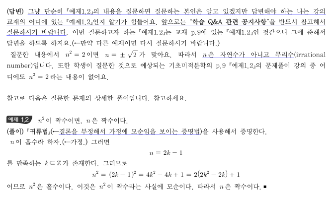 예제 1.2에서 대우는 참인데 왜 원래 명제에 모순이 있는건가요? 대우가 참이므로 명제도 참 아닌가요? n제곱이 2일때 n은 루트2 가 되므로 모순이 있지 않나요?