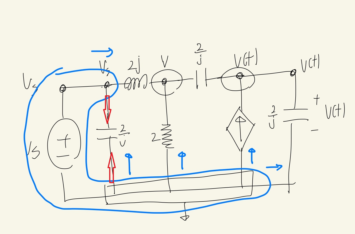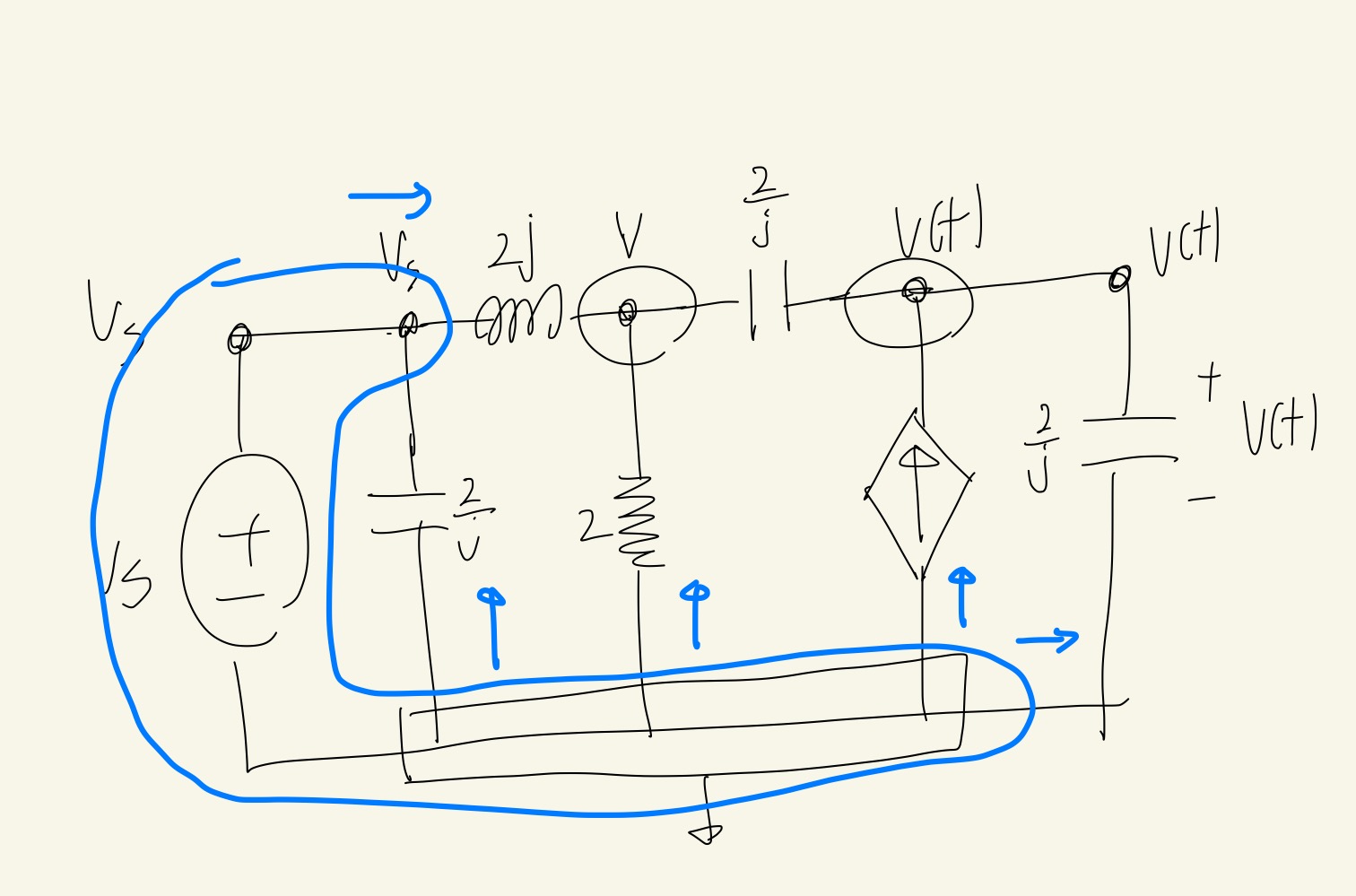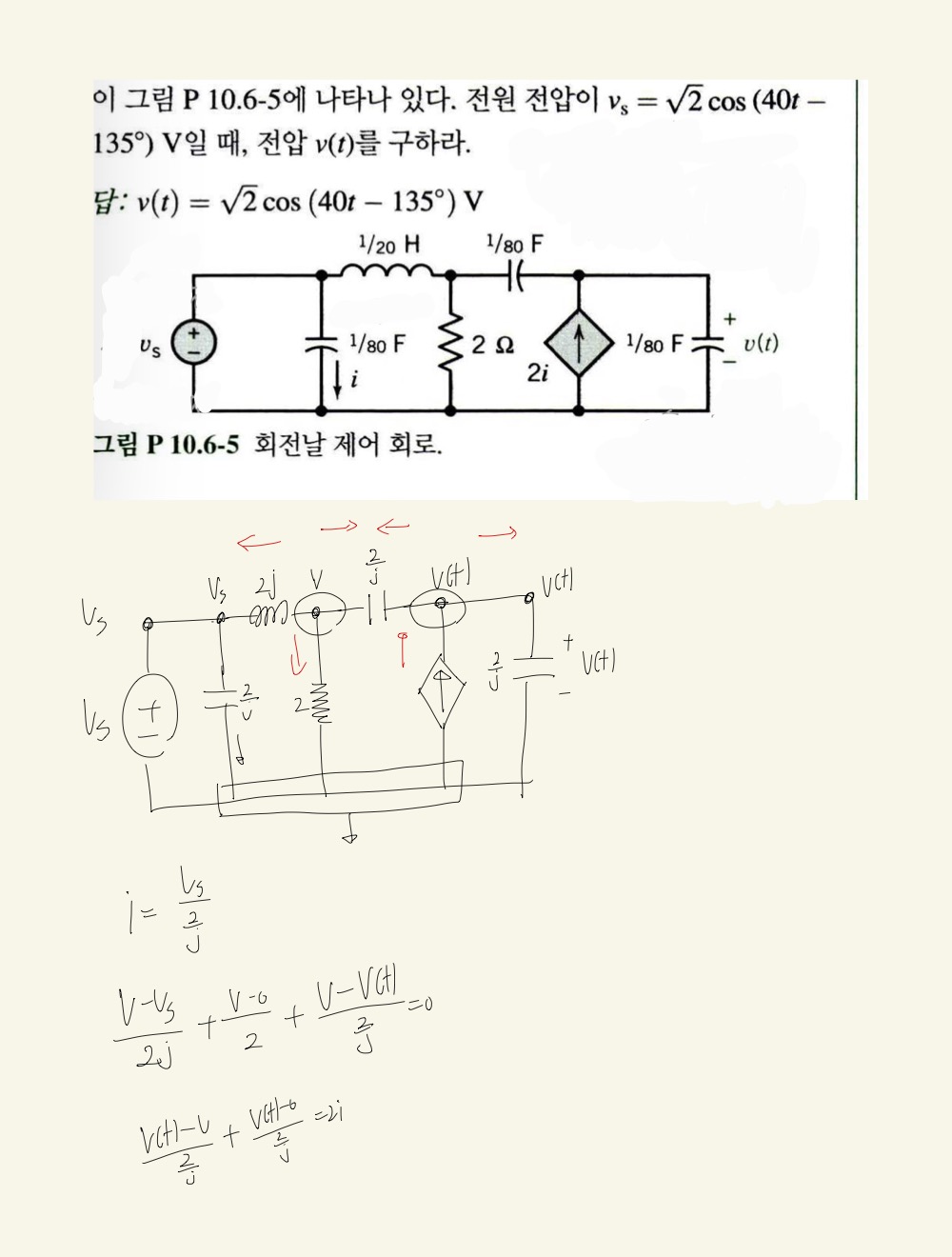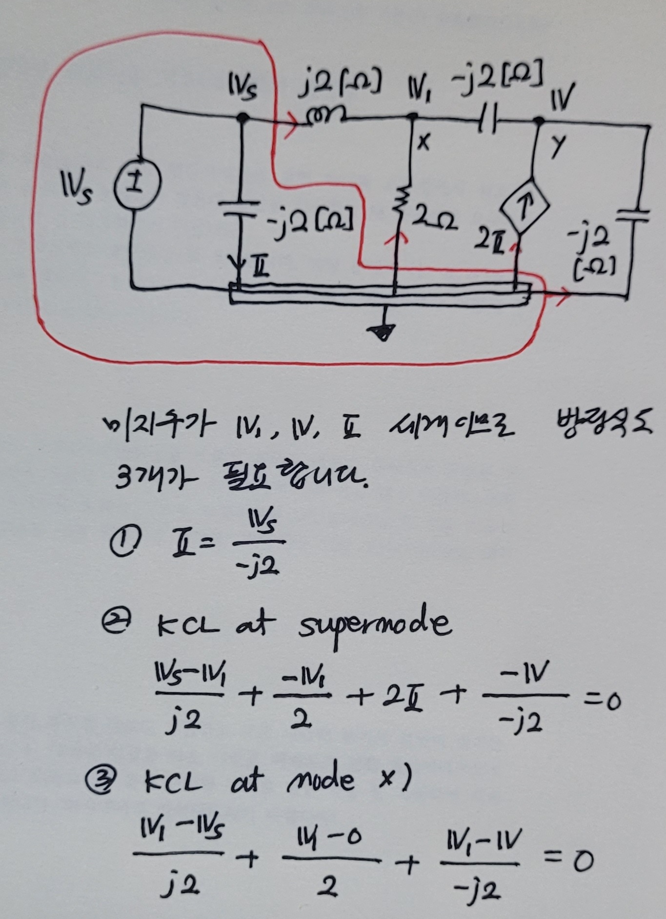 2. 주어진 회로의 미지수는 I, V1, V 이렇게 3개이므로 방정식도 3개만 세우면 충분합니다. 그래서 I=Vs/(-j2), 수퍼노드에서 세운 KCL방정식 외에 방정식을 하나만 더 세우면 됩니다. 즉, 첨부사진의 x, y마디 모두에서 KCL을 세울 필요는 없고 x 또는 y 마디 중 하나에서만 KCL을 세우면 됩니다.