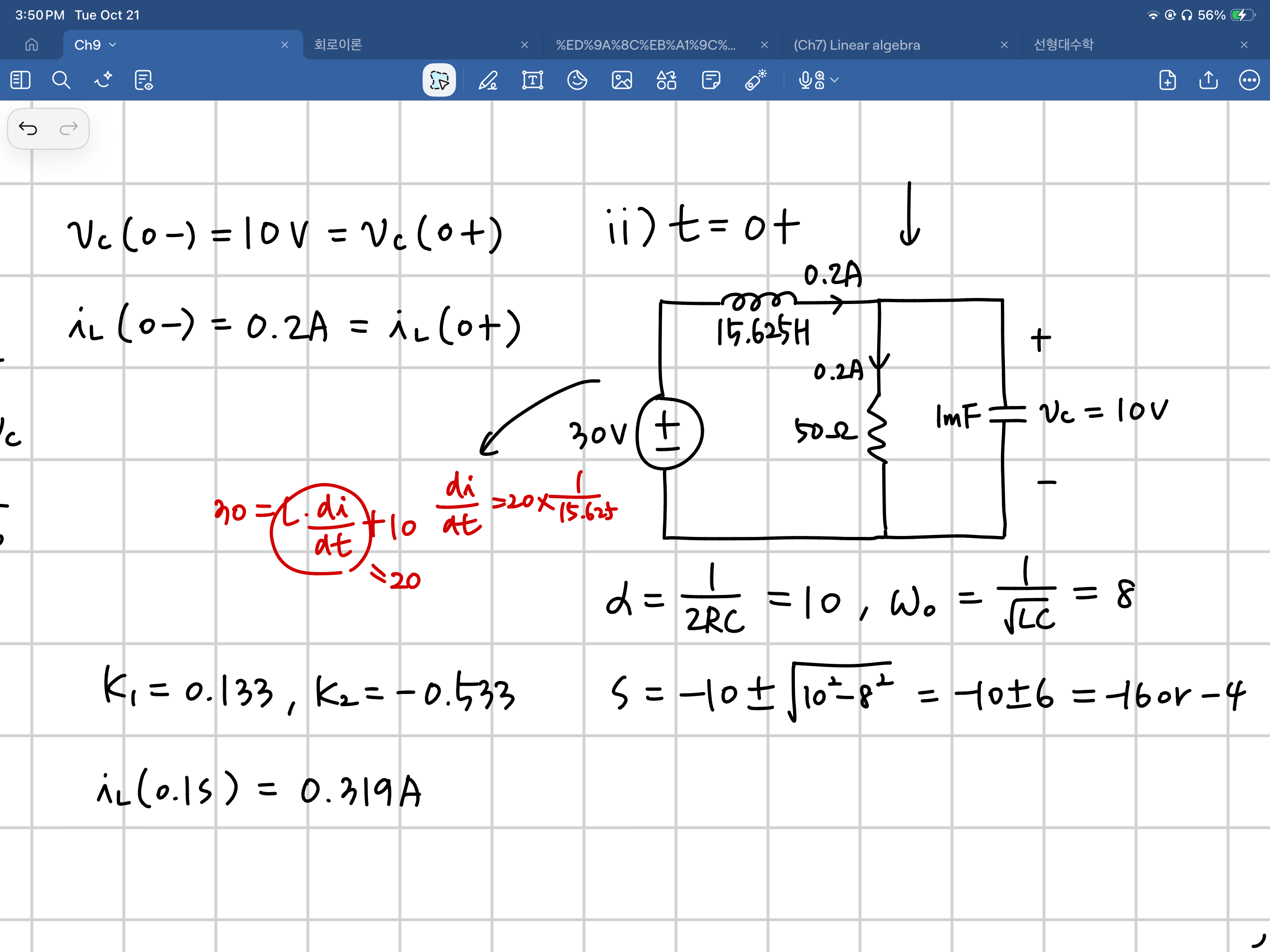 t=0+ 에서 회로의 모습이 그림과 같을 때 저항이 전압원의 30V가 아닌 커패시터의 10V를 가지게 되는지 궁금합니다. 그리고 저항이 10V의 전압을 가지면 전류는 0.2A가 흐른다는 의미인데 그럼 iL(0+)=0.2A이니 커패시터의 전류는 0이 되는 것인지도 여쭙고 싶습니다.