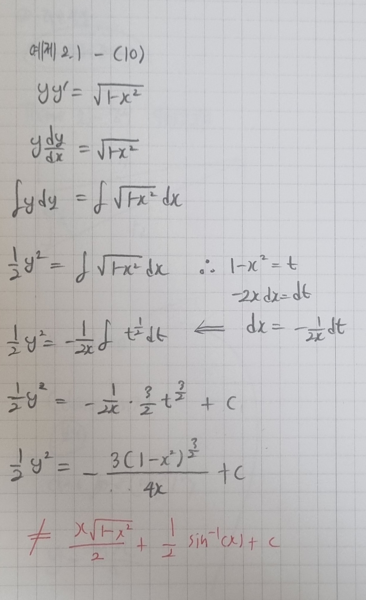 이미지에 제시한 것 처럼 풀이를 진행했는데, 답지와는 전혀 다른 답이 나와서 좀 당황했습니다.. 적분해서 sin역함수가 나오려면 1/sqrt(1-x^2)이 있어야 하는데 그러한 식도 못찾겠고, 답지에는 항이 여러개 존재하는데 제 풀이는 적분상수를 제외하면 항이 한 개로 정리됩니다. 답지와는 다른 답이지만 맞는 풀이인건지, 부족한 부분이 뭐였는지, 개념적으로 부족한건 없는지 궁금합니다 답변 완료된 질문과 답변은 수정 및 삭제가 불가합니다. |