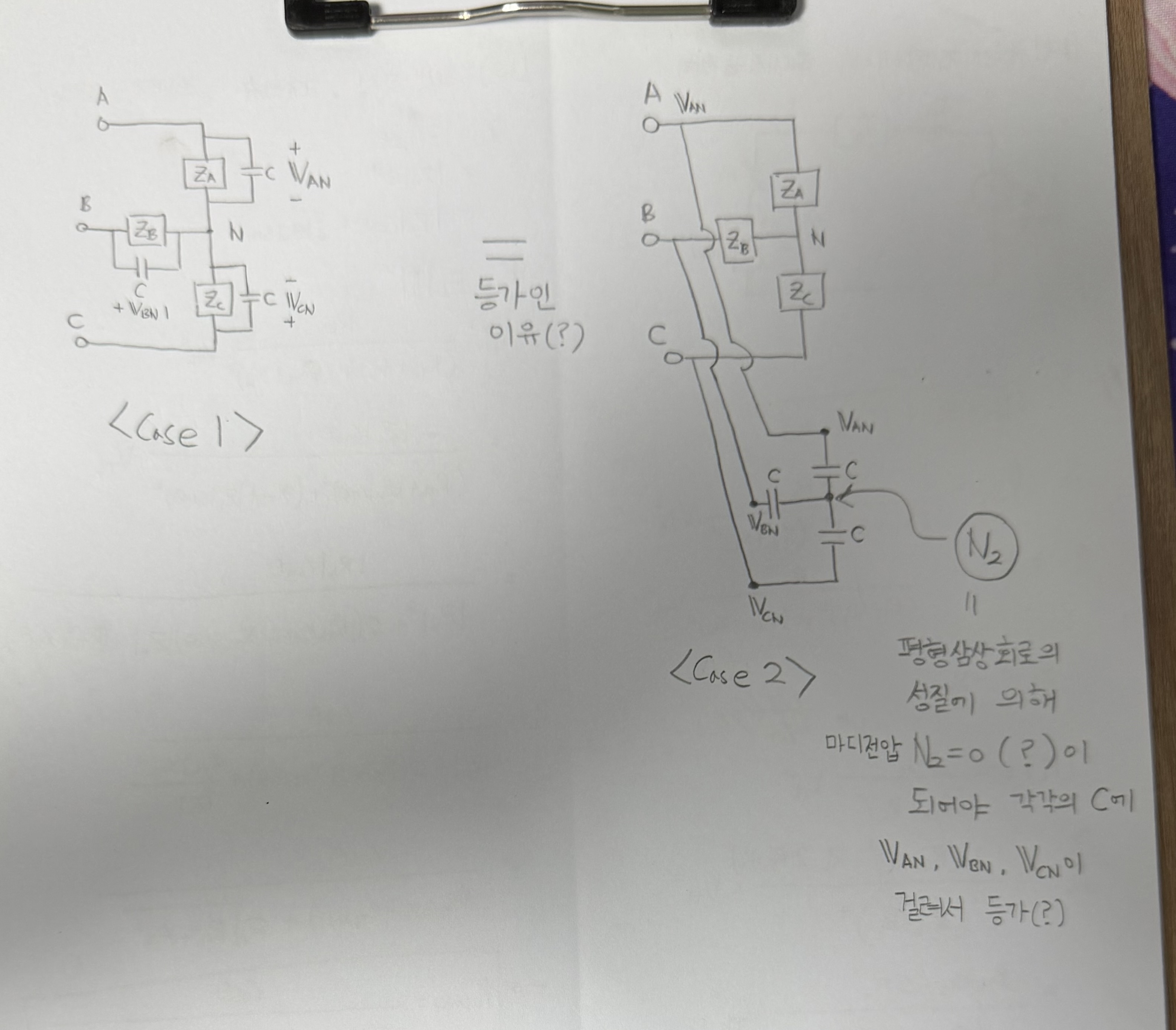 안녕하세요 교수님. 회로이론 예제 11.5(변형) 문제의 (e)문제에서 각각의 부하에 커패시터를 병렬로 연결해서 역률을 높이는 부분에서 커패시터의 값은 구했습니다. 그런데 (각각의 부하에 커패시터를 각각 병렬로 연결하는 것)과 (교수님께서 Y결선된 커패시터를 선로에 연결하는 것)이 등가회로라는 부분이 이해가 잘 안되어서 질문 드립니다. 제가 나름대로 생각해본 바로는 Y결선된 커패시터를 교수님과 같이 연결하면 이 또한 평형삼상회로여서 커패시터가 연결된 마디(N2)의 마디전압이 0이 되고, 따라서 (각각의 부하에 커패시터를 각각 병렬로 연결하는 것)상황과 같은 단자 전압이 각각의 커패시터에 걸리게 되어서 등가일 것 같다고 생각했습니다. 너무 글이 난잡할 것 같아서 첨부파일에 궁금한 부분에 (?)표를 표시해 두었습니다.