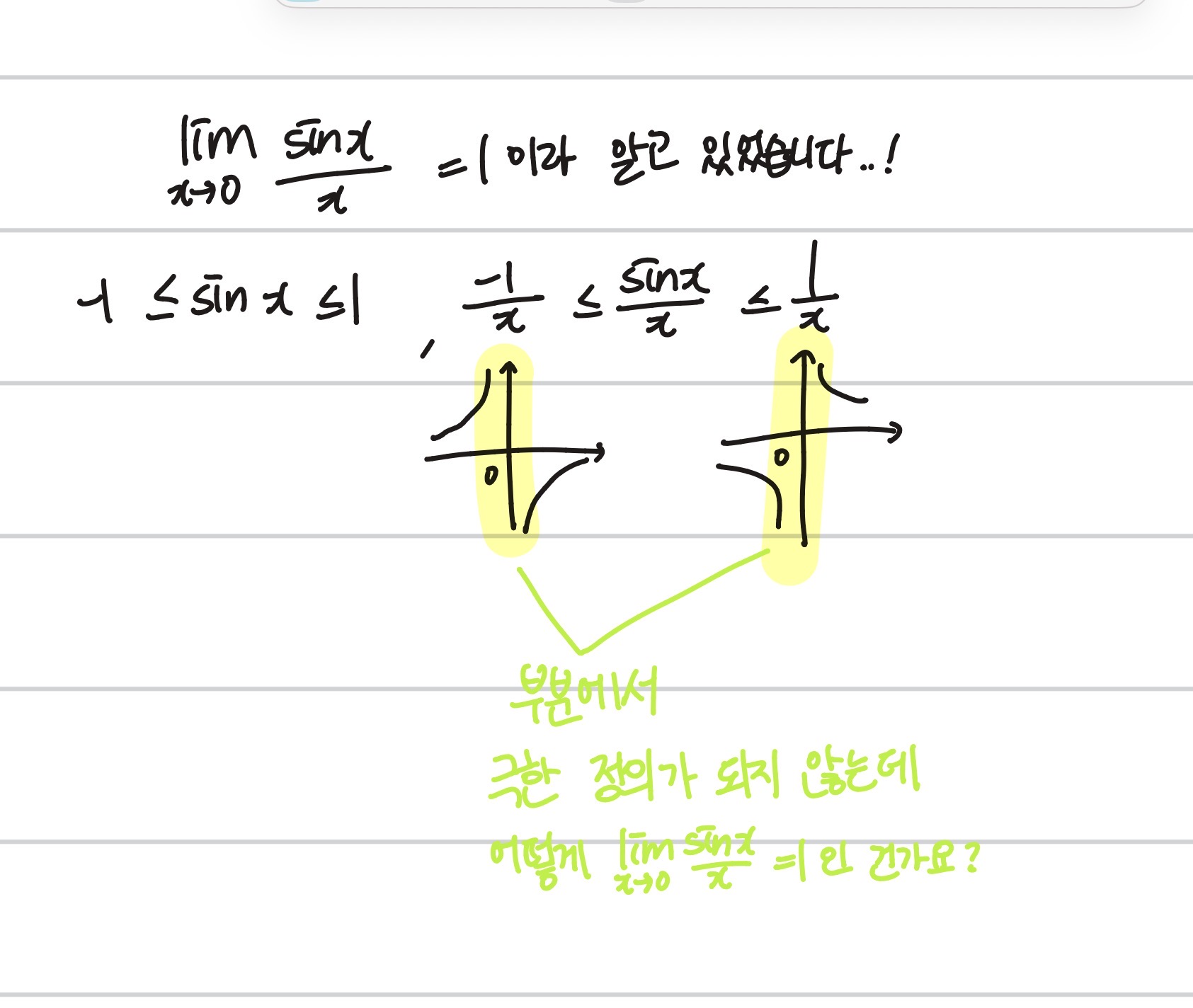안녕하세요! 해당 부분에 대해서 답변을 드리도록 하겠습니다. 만약 x->0에서 샌드위치 정리를 사용하게 된다면