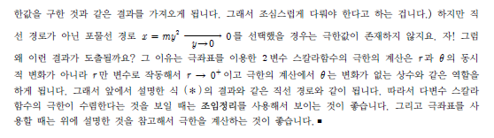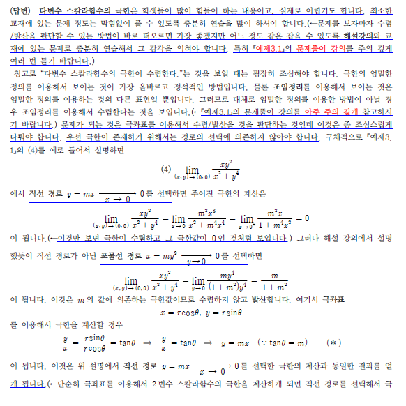 미적분학2를 듣고있는 학생입니다. 지금 제가 듣고있는 파트는 다변수 스칼라 함수의 극한 파트입니다. 제가 아는 극한을 푸는 방법은 조임정리, 극좌표 이용, y=mx같이 바꾸어서 푼다던지, x축y축 경로는 설정해서 푸는 방법들이 있습니다. 어떤 상황에서 각각에 맞게 쓰는건지도 알려주시면 감사하겠습니다. 어떤 방식을 어떻게 쓰는지 잘 감이 안잡히네요. 문제를 꽤 풀어봐도 특정 상황에서는 잘 안먹히고 그러더라고요. 답변 완료된 질문과 답변은 수정 및 삭제가 불가합니다. |