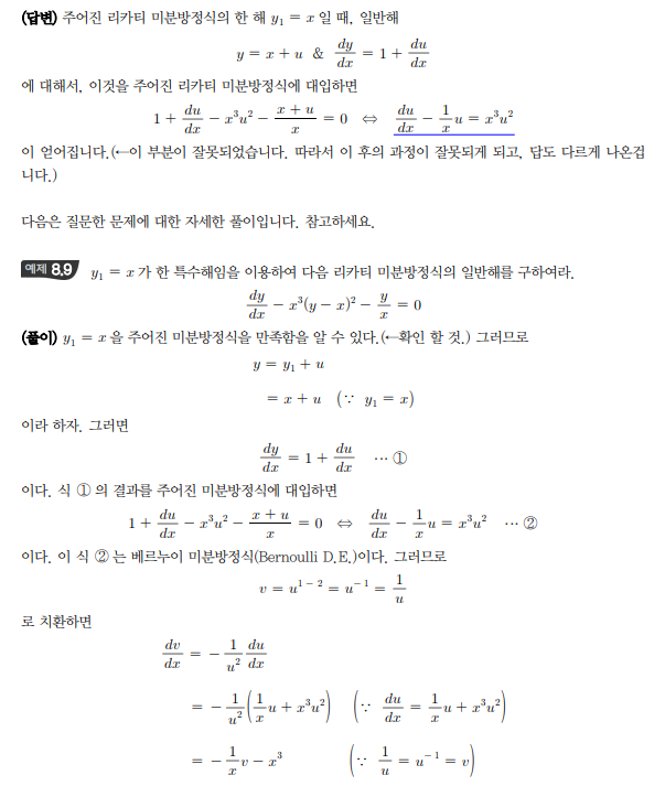 교수님 항상 친절하게 답변해 주셔서 감사합니다. 8.9 리카티 미분방정식을 풀어서 베르누이 방정식 형태까지 유도했는데 마지막 답이 solution 이랑 달라서 질문드립니다. 혹시 풀이과정중에 틀린게 있나요?