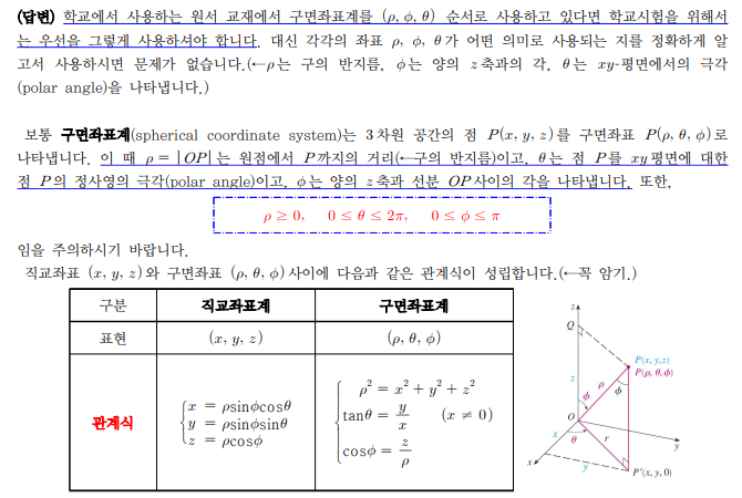 미적분학 2 / 다변수 함수의 삼중적분 / 구면좌표계 구면좌표계에서 구면좌표를 학교에서 쓰던 원서는 순서인데 교재에서는 phi 와 theta 순서가 바뀌어 있더라구요 순서가 정해져 있다고 들었는데 서로 다른데 큰 문제는 없나요?