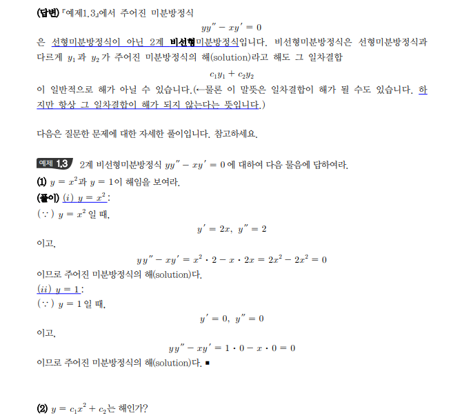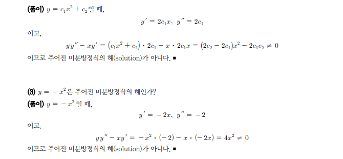 예제 1.3 (2) 에 y 식이 해인가? 라고 책에서 질문했는데, 저는 "해이다" 라고 썼습니다. 근데 solution을 보니 "아니다"라고 되어있습니다.