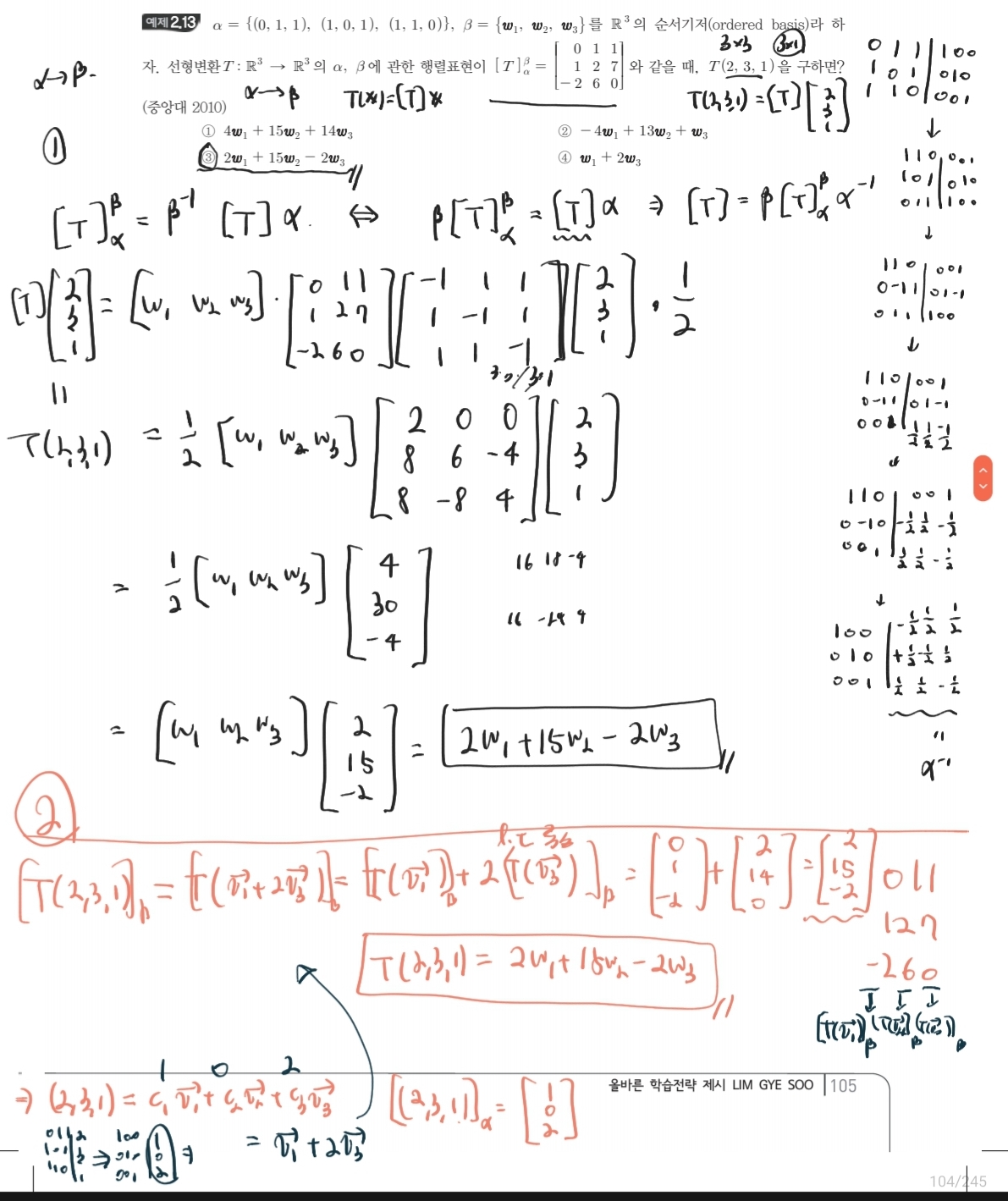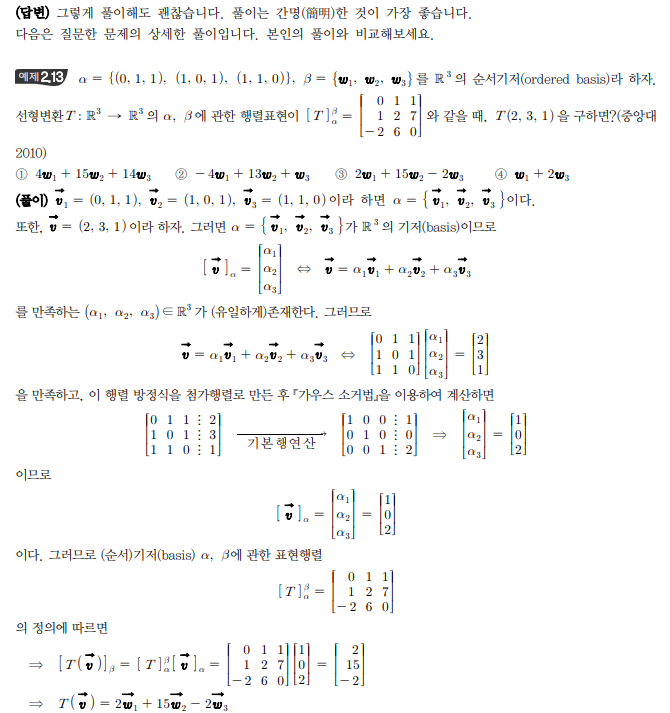 선형대수학 / 선형변환 / 예제 2.13 의 풀이과정입니다만 서술형의 문제였다면 빨간 줄 아래 부분의 풀이로 서술해도 괜찮을까요?