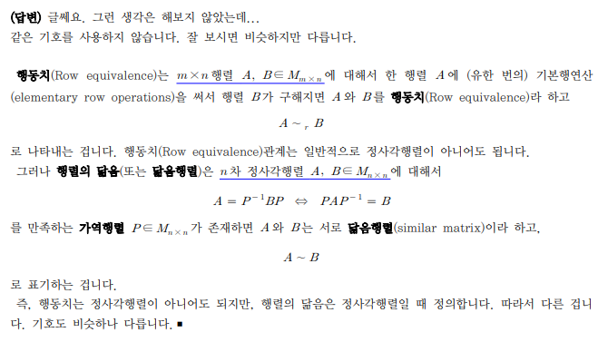 닮음행렬(A=PBP^-1)임을 표시하는 기호와, 행동치인 행렬을 표시하는 기호가 A~B로 동일하던데 두 개념간에 무슨 관계가 있는지 궁금합니다 감사합니다 답변 완료된 질문과 답변은 수정 및 삭제가 불가합니다. |