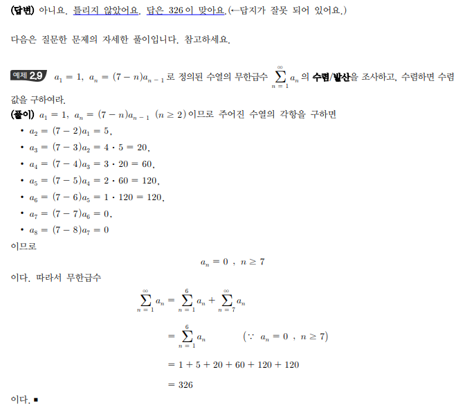 파트 8, 예제문제 2.9 프린트 282p입니다. 교재 답은 325로 나오는데 저는 326이 나와요. 제가 틀린건가요? 확인 부탁드립니다. 답변 완료된 질문과 답변은 수정 및 삭제가 불가합니다. |