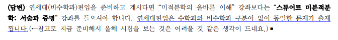 안녕하세요 임계수교수님, 저는 연세대(비수학과)편입을 준비 학생입니다. 편입학을 위해서는 미적분학을 공부해야 하는 상황인데요, 저같은 편입준비생이 `미적분학의 올바른 이해` 강좌를 수강하는 것이 괜찮을까요? 해당강좌 수강대상에 편입준비생은 포함되어 있지 않아 질문드립니다.