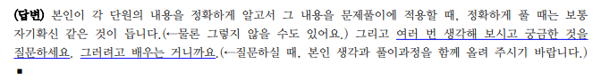 안녕하세요. 인강으로 기초수학부터 차근차근 쌓고 있는 학생입니다. 교수님 강의 잘 듣고 있는데요. 하나 여쭤보고 싶은게 있어서 여쭤봅니다. 해설지는 없는 것 같고 풀어주시는 문제외에는 답만 나와있는 것으로 보이는데 풀이를 풀고 제가 맞았는지 틀렸는지는 어떻게 확인해야되는지 질문드립니다. 문제 개수가 적은 경우도 있고 많을 때도 있는데 이것이 다 질문칸에 올려 확인하기엔 양이 많은 것 같아서요.