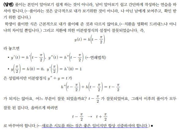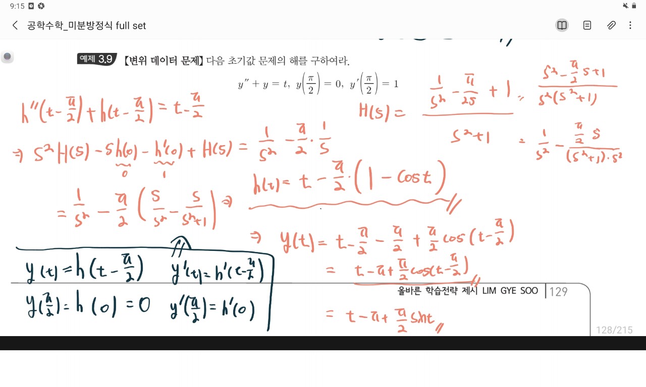 공학수학 / 미분방정식과 라플라스 변환 / 변위 데이터 문제 예제 3.9 에서 첨부파일과 같이 풀어 보았습니다만, 교수님이 t~ = t + pi/2 로 새로운 변수를 두어 문제풀이 하신것과는 달리 풀었습니다 잘 푼 것 같습니다만 답이 역변환 직후 식에서 cost 가 있는 항의 부호가 정반대로 나오면서 답이 틀렸습니다 ..