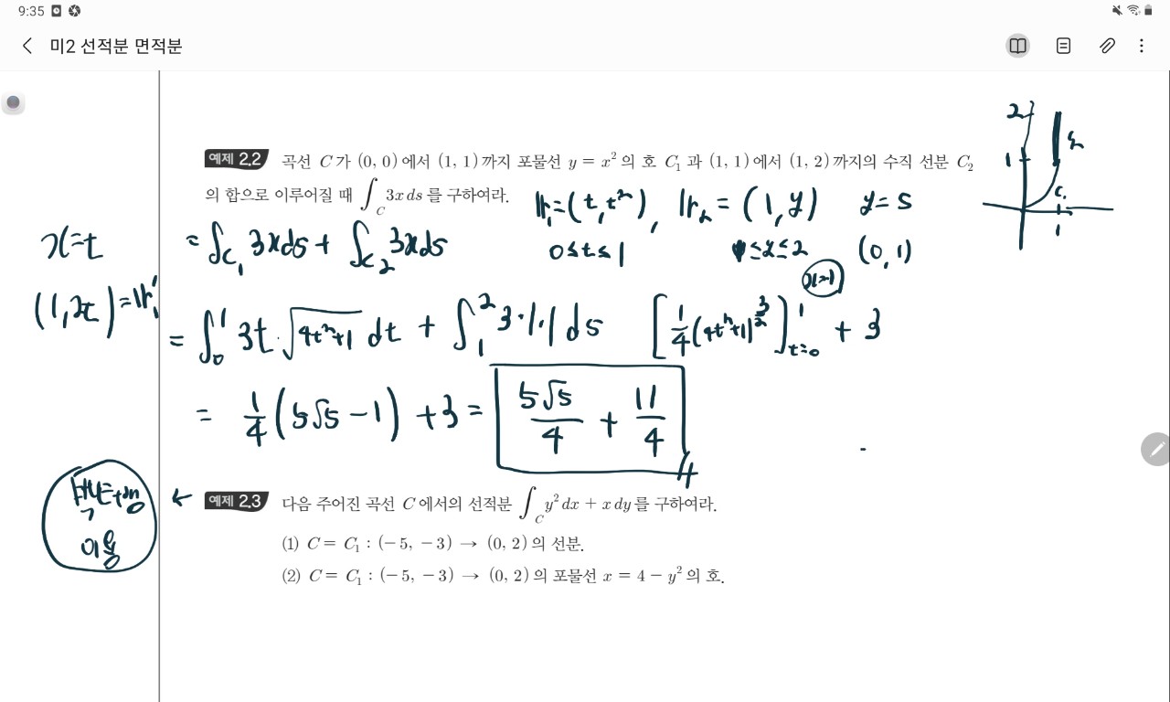 미적분학 2 / 다변수 벡터함수 - 선적분 / 예제 2.2 에서 C2 구간에서 x=1 로 고정된 상태이고 y 가 1 부터 2까지인데, 이럴 경우 (1,t) 1<=t<=2 가 되어야 하지 않나요?