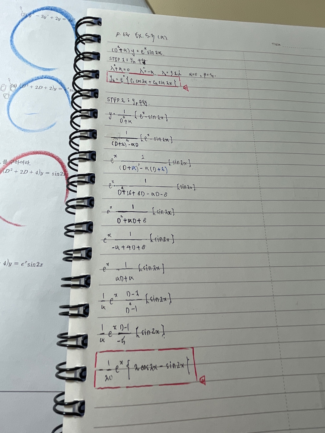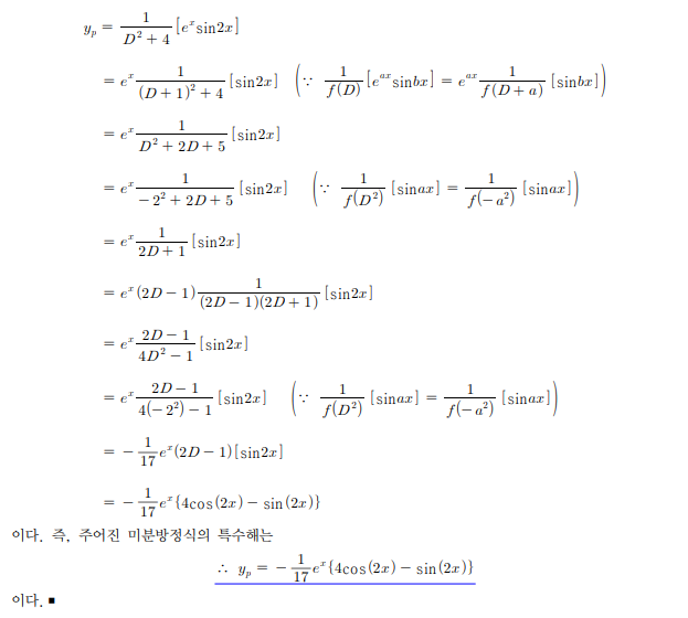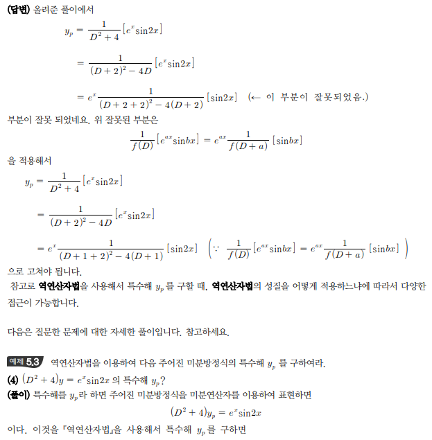 제가 y p 를 구하기 위해 역연산법을 이용했는데 솔루션과 답이 계속 다르게 나옵니다. 혹시 제 풀이과정 중 틀린 부분이 있는지 확인 부탁드려도 되겠습니까? 감사합니다. 답변 완료된 질문과 답변은 수정 및 삭제가 불가합니다. |