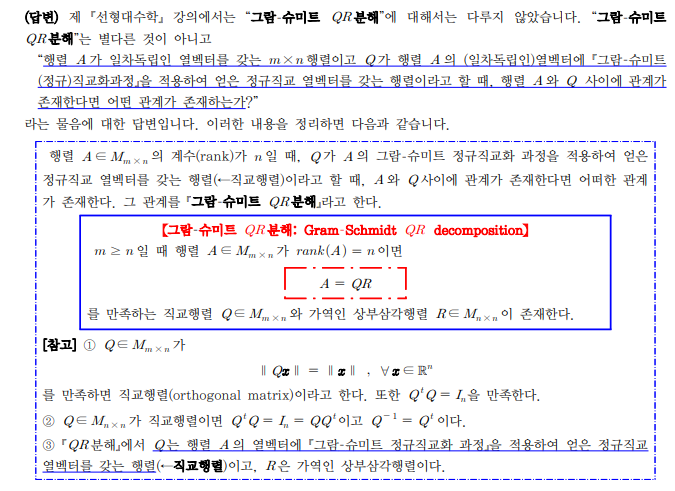 선형대수학 / 직교성과 그람슈미트 직교화과정 부분을 공부하는데, 제가 사용하는 다른 교재에서는 위 내용과 함께 QR 분해라는 내용을 서술합니다만,