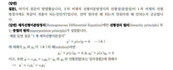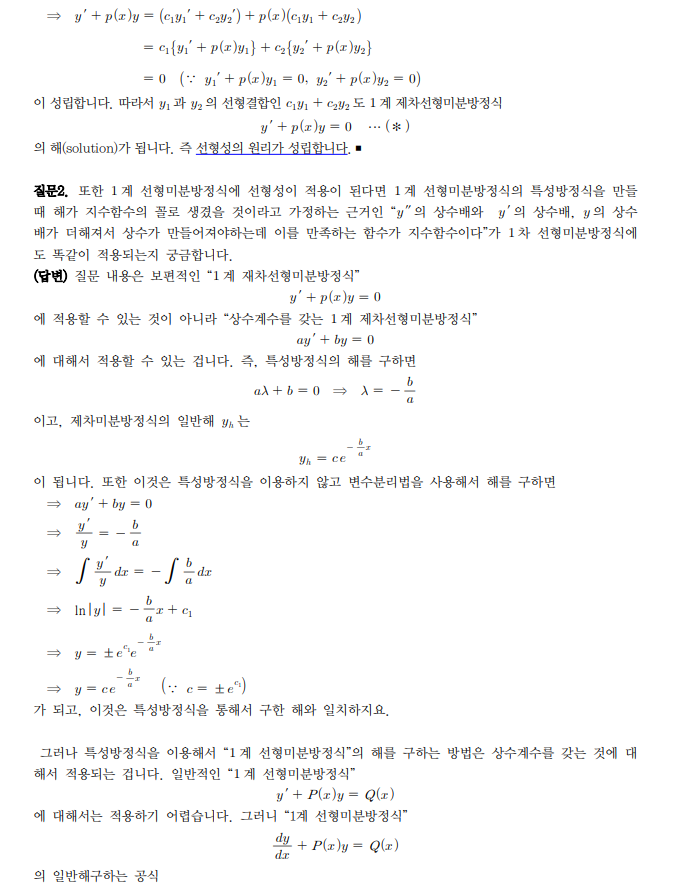 2차 미분방정식 y`` + ay` + by = f(t)에 대해서 해 y가 y`` + ay` + by = 0의 일반해 y_n과 y`` + ay` + by = f(t) 의 특수해 y_p의 합인 y = y_n + y_p으로 나타내어져서 2차 회로를 이렇게 푸는 것은 이해가 갑니다. 여기서 질문이 발생했습니다. 2차 비제차 선형미분방정식의 선형성(중첩성)이 1차 비제차 선형방정식에도 똑같이 적용이 되는것인가?입니다. 만약 된다면 왜 되는지 안된다면 왜 안되는지 궁금합니다. 또한 1차 선형미분방정식에 선형성이 적용이 된다면 2차 선형미분방정식의 특성방정식을 만들 때 해가 지수함수의 꼴로 생겼을 것이라고 가정하는 근거인 "y``의 상수배와 y`의 상수배, y의 상수배가 더해져서 상수가 만들어져야하는데 이를 만족하는 함수가 지수함수이다"가 1차 선형미분방정식에도 똑같이 적용되는지 궁금합니다.