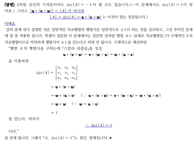일반적인 직교행렬이 아니라 3차원 공간의 기저들이라 det(A) = -1은 될 수 없는 것 같은데, 평행육면체의 크기|u.(vxw)| (=|A|) 가 0 이상이기 때문에 det(A) >=0 이기 때문이 아닌가 하는 생각이 들었습니다