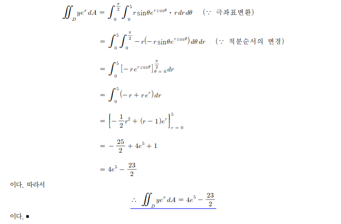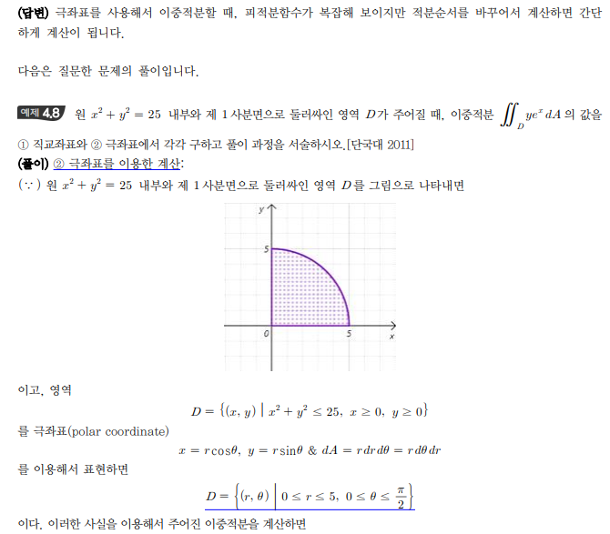 | 제목 | 답변완료 미적분학 2 /다변수함수의 이중적분 /예제4.8 극좌표 계산 | ||