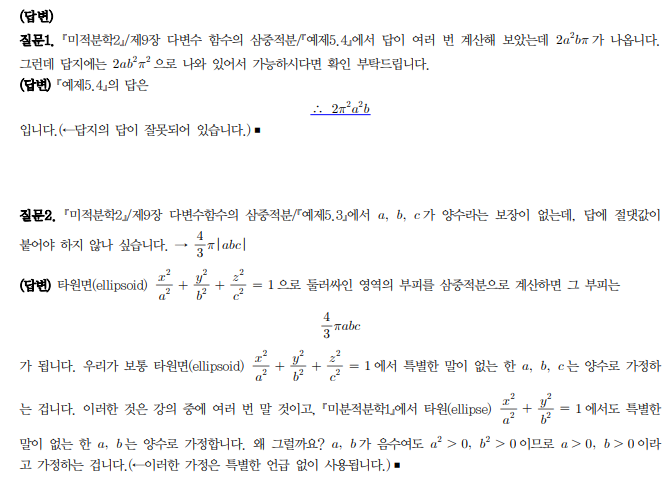 그리고 미적분학 2 / 다변수함수의 삼중적분 / 예제 5.3 에서 a,b,c 가 양수라는 보장이 없는데, 답에 절댓값이 붙어야 하지 않나 싶습니다 -> (4pi/3)|abc| 답변 완료된 질문과 답변은 수정 및 삭제가 불가합니다. |
