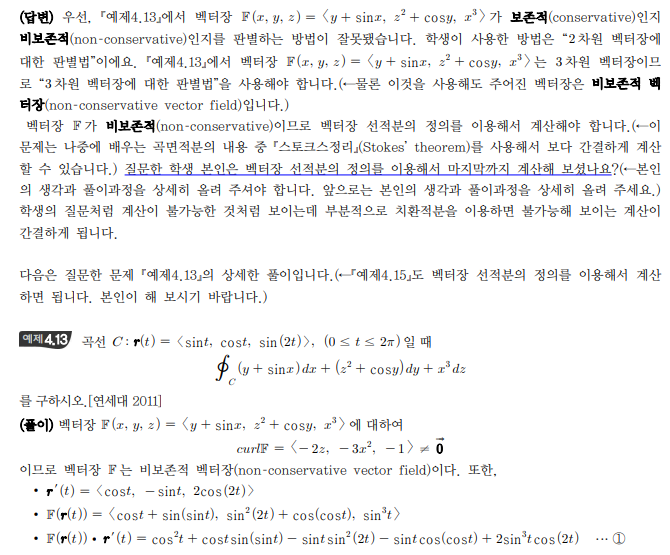 미적분학 다변수 벡터함수의 선적분 예제 4.15 에서도 보존적 벡터장이 아닌 것 같은데 일반적인 선적분을 적용하는 것이 맞나요? 4.15는 비교적 4.13 에 비해 간단해 보입니다 답변 완료된 질문과 답변은 수정 및 삭제가 불가합니다. |