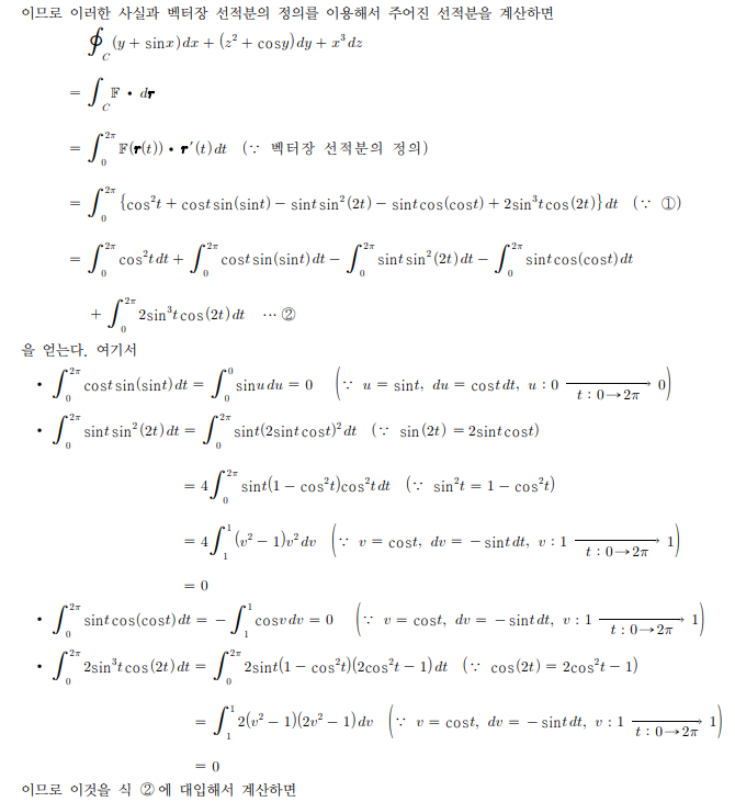 일반적인 선적분을 적용하려 하니 sin(sint) , cos(cost) 등 적분이 불가능해 보이는 함수들이 꽤 생깁니다 일반적인 선적분을 적용하는 것이 맞는지 궁금하고 풀이과정 부탁드립니다