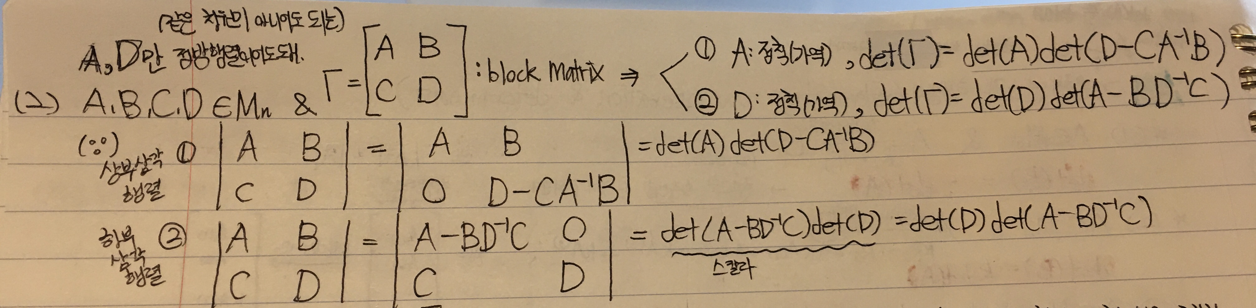 이 문제를 A,B를 block matrix로 만들어서 block matrix의 행렬식 공식으로 풀고 싶은데 이때 이 공식은 A, D만 정방행렬이어도 사용할 수 있다고 들었습니다. 근데 A의 행렬식을 구할 때부분행렬 A는 특이고,부분행렬 D가 정칙이므로 이에 대한 공식을 사용하고 싶은데 부분행렬 B의 행렬식이 0이 됩니다. 이때는 이 공식을 쓸수 없는건가요? 그렇다면 행렬을 삼각화해서 풀어야 하나요? 공식사진을 첨부합니다. block matrix의 행렬식 공식 ㅇ에 대한 강좌 내용은 17강 13분입니다.