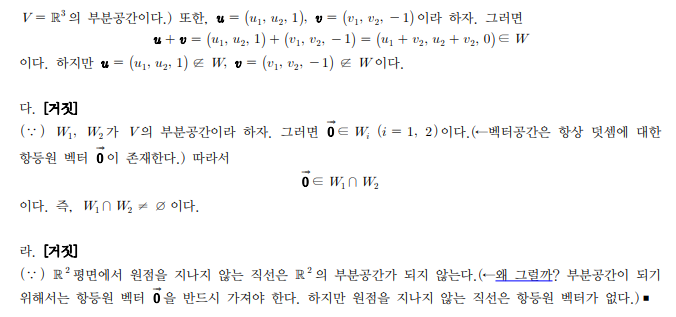 1.12에 대한 정확한 풀이를 알고 싶습니다. <가>는 벡터공간은 영공간과 자기자신, 덧셈에 대한 항등원 집합 적어도 3개의 서로 다른 부분공간을 가지므로 옳지 않은 것으로 판단했습니다. <다>는 부분공간이라면 반드시 0벡터를 포함하므로 옳지 않은 것으로 판단했습니다. <라>는 R 2 의 부분공간은 반드시 0벡터를 포함하고, 평면상의 모든 직선은 원점을 지난다는 보장이 없으므로 R 2 의 부분공간이라는 보장이 없는 것으로 판단했습니다. 위 판단 근거가 옳은가요? 그리고 <나>는 어떤 이유로 옳지 않은 것인가요? 알려주시면 감사하겠습니다. 답변 완료된 질문과 답변은 수정 및 삭제가 불가합니다. |