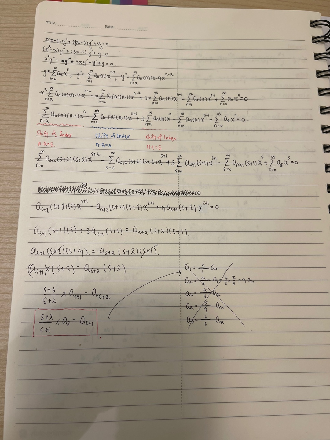 이 점화식을 통해 맥클로린 급수형태를 파악해서 y1을 구한다음 라그랑지 차수축소법을 이용해 다른 한 해를 구하는 것 까지는 알겠지만, 점화식에서 맥클로린 과정으로 가는 과정이 막혔습니다.
