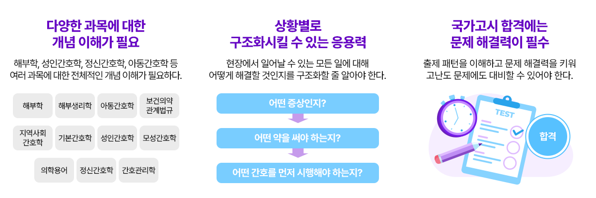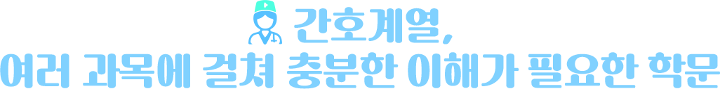 해부학, 성인간호학, 정신간호학, 아동간호학 등 여러 과목에 대한 전체적인 개념 이해가 필요하다.