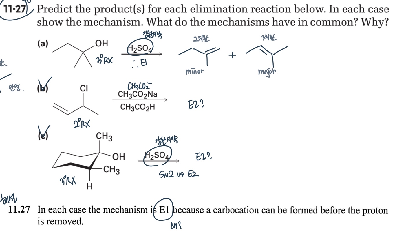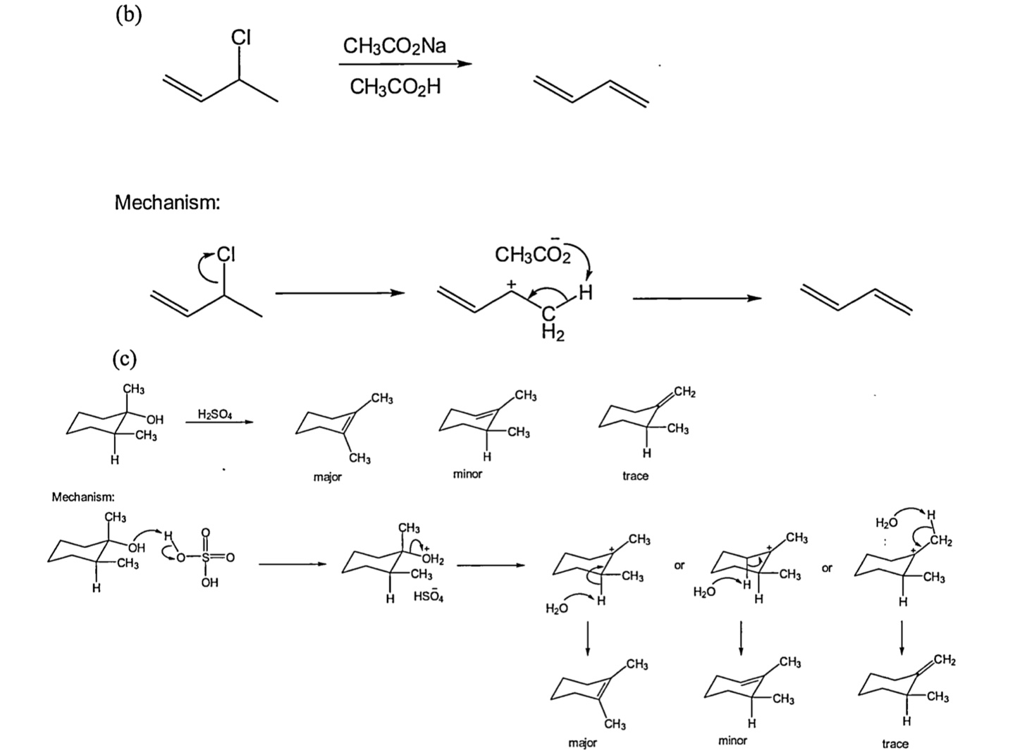 c) 3차 알코올 + 산촉매는 전형적인 산촉매 탈수반응이며 대표적인 E1반응입니다. 이 내용은 알켄 제법에서 배우셨습니다.