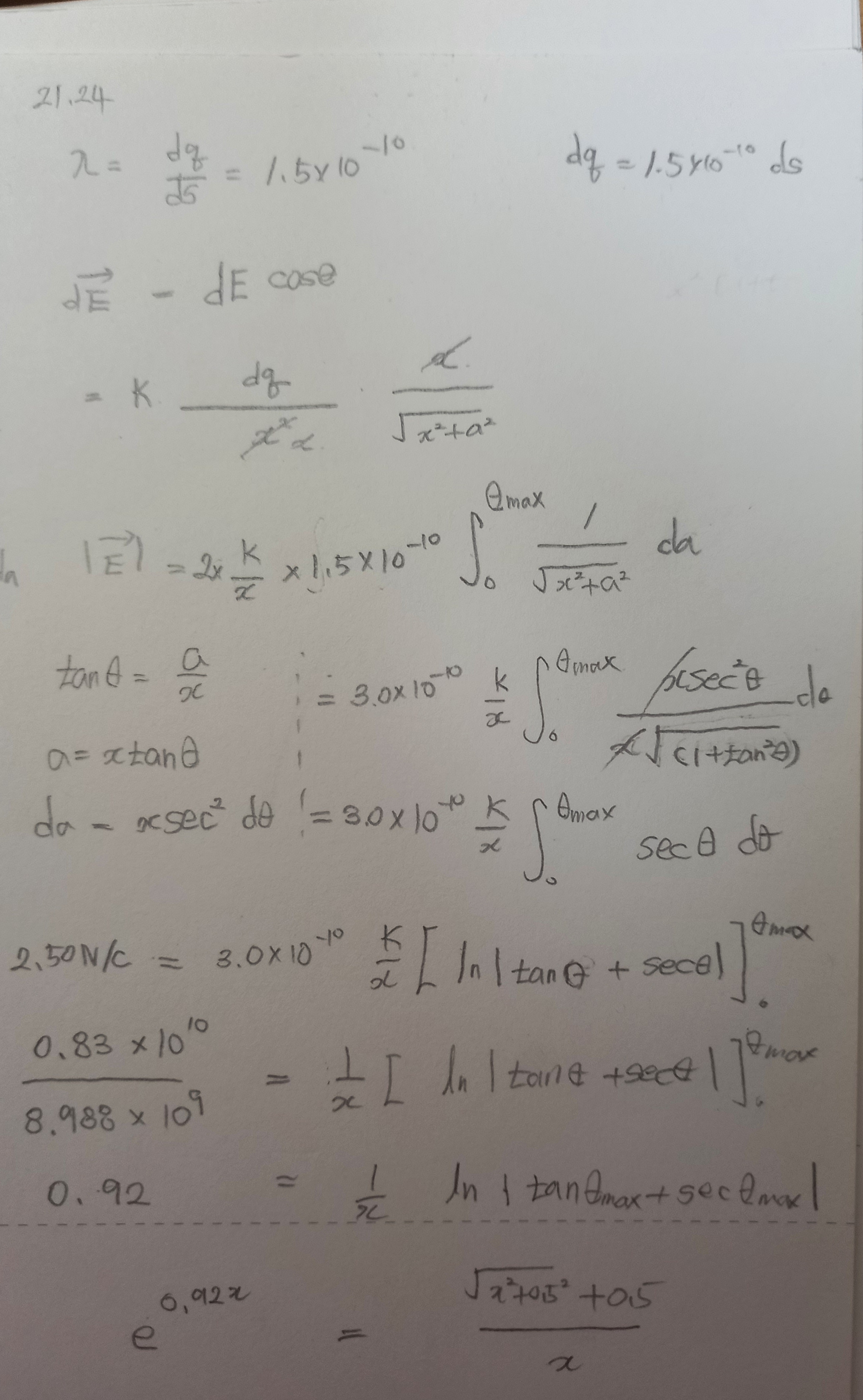 아마도 질문하신 상황이...무한 직선 절연체 구조를 띤 대전체에 의한 전기장을 구하는 상황인 듯 합니다.