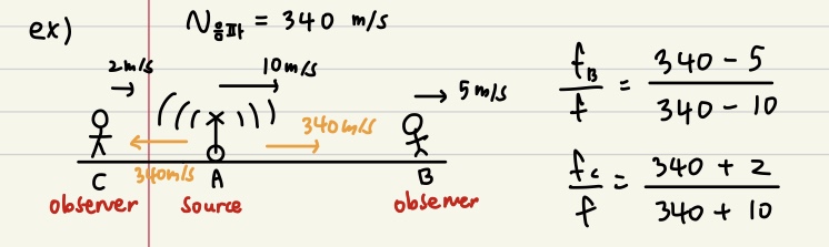질문2. 마찬가지 방식으로, fC/f에서 f를 나타날때, 쉽게 생각하기위해서 A가 가만히 있고 C가 움직인다고 생각하면,이동방향과 다른 방향으로 가니까 A기준이면 340-10이여야 하는 게 아닌가요? 왜 340+10인지 잘 모르겠습니다