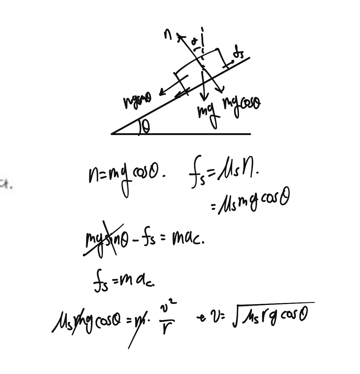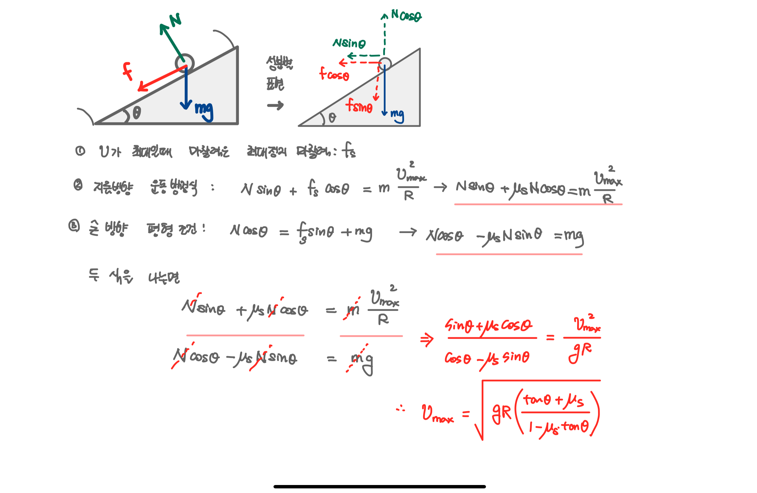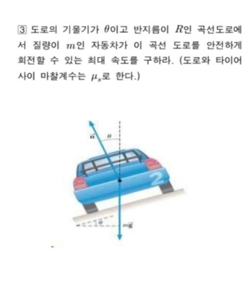 저는 mgsin@도 고려를 해서 답을 구하면 속도 v = 루트(R x g x (sin@ - (최대마찰계수)xcos@))가 나왔는데 친구들은 mgsin2를 무시하고 풀어서 v = 루트((최대마찰계수) x R x g x cos@)가 나왔습니다.