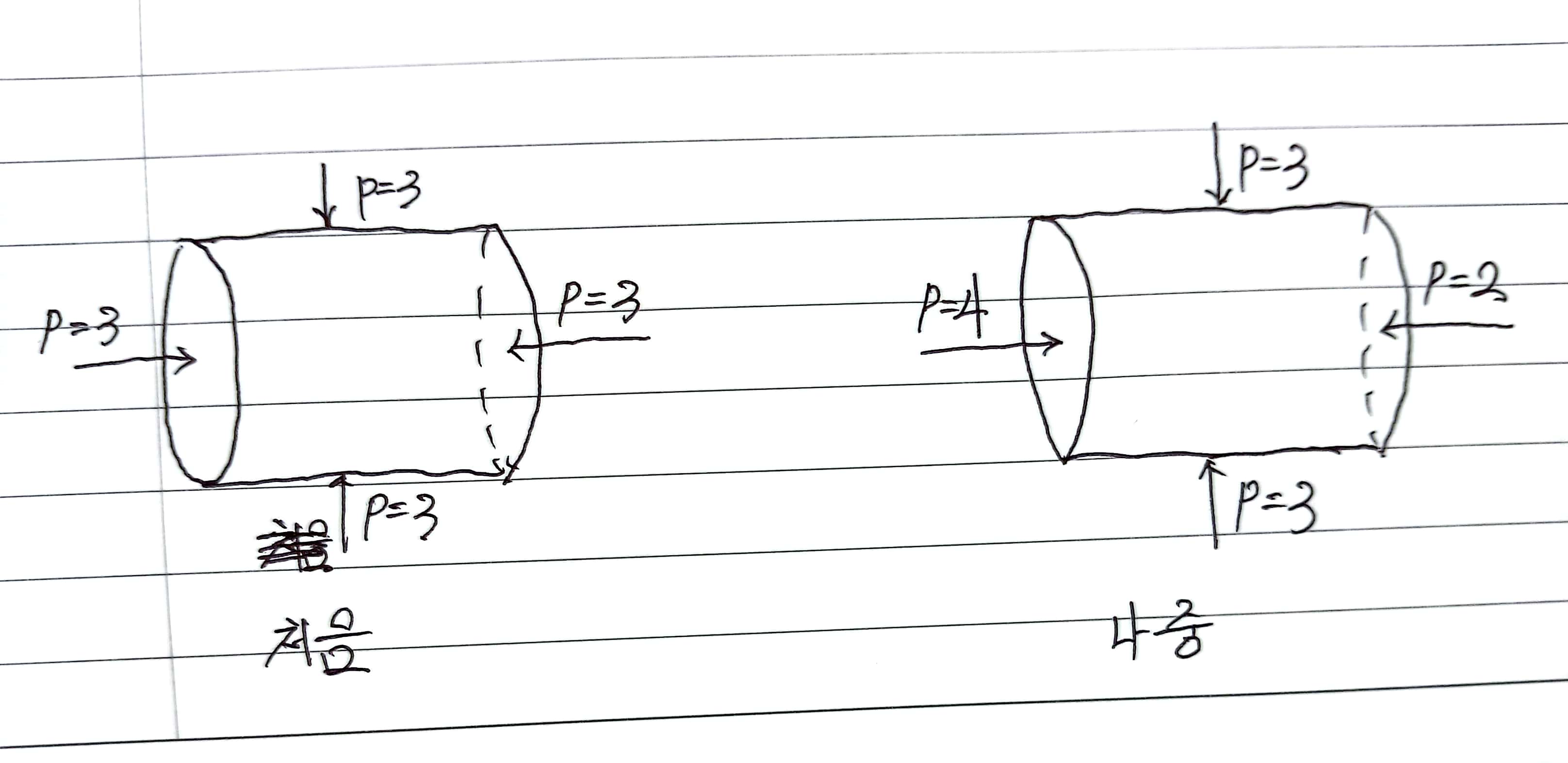부피탄성률에서 △P는 나중 압력-처음 압력으로 알고 있습니다. 만약 첨부한 그림과 같이 원통형 기체 요소에 처음에 모든 면에 가해지는 압력이 3 나중 어느 순간에 원기둥에 가해지는 압력이 옆면은 3으로 같은데, 윗면과 밑면이 각각 4, 2일 때, (2+4)/2=3이므로 평균적으로 △P =0인 상황이라고 해도 되나요?
