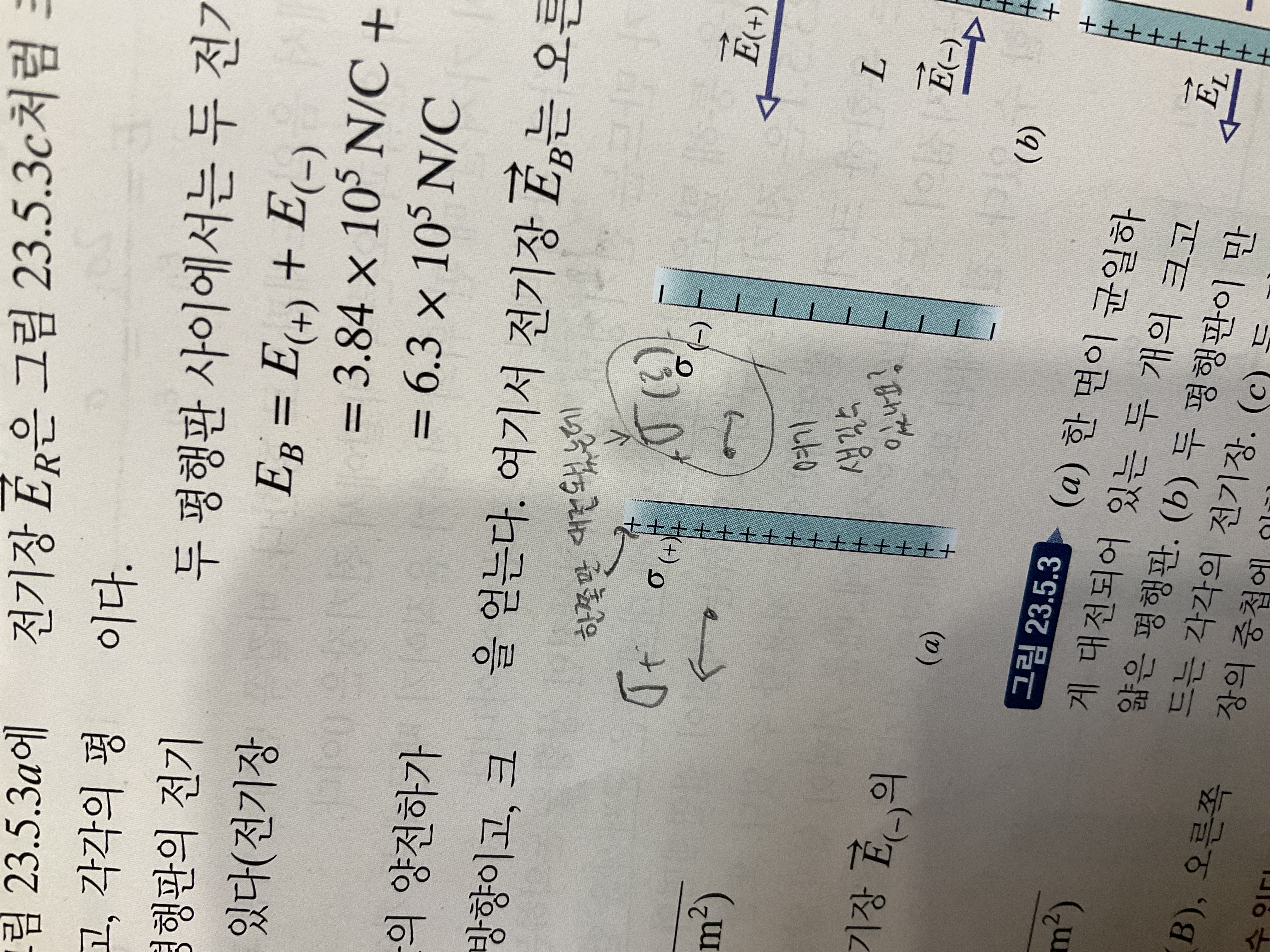 그림은 얇은 판이 아니라 약간의 두께를 고려한 전하 분포를 나타낸 것인데, 얇은 판에 의한 전기장을 이해할 때는 전하의 쏠림현상은 고려하지 않아도 됩니다.