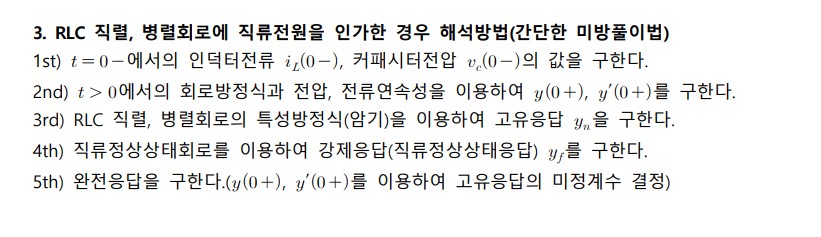 또한 이렇게 고유응답이 발산하여서 직류정상상태가 존재하지 않을 때는 인덕터를 단락시키고 커패시터를 개방시키는 방식으로 강제응답을 구하면 안되는지 문제되는데 인덕터를 단락시키고, 커패시터를 개방시켜서 전압, 전류를 구하는 방법은 본질적으로 직류전원에 대한 강제응답을 구하는 것이므로 고유응답의 0으로의 수렴, 발산 여부에 관계 없이 적용할 수 있습니다. 다만 이 경우 정상상태는 존재하지 않으므로 그냥 강제응답이라고만 해야 합니다.