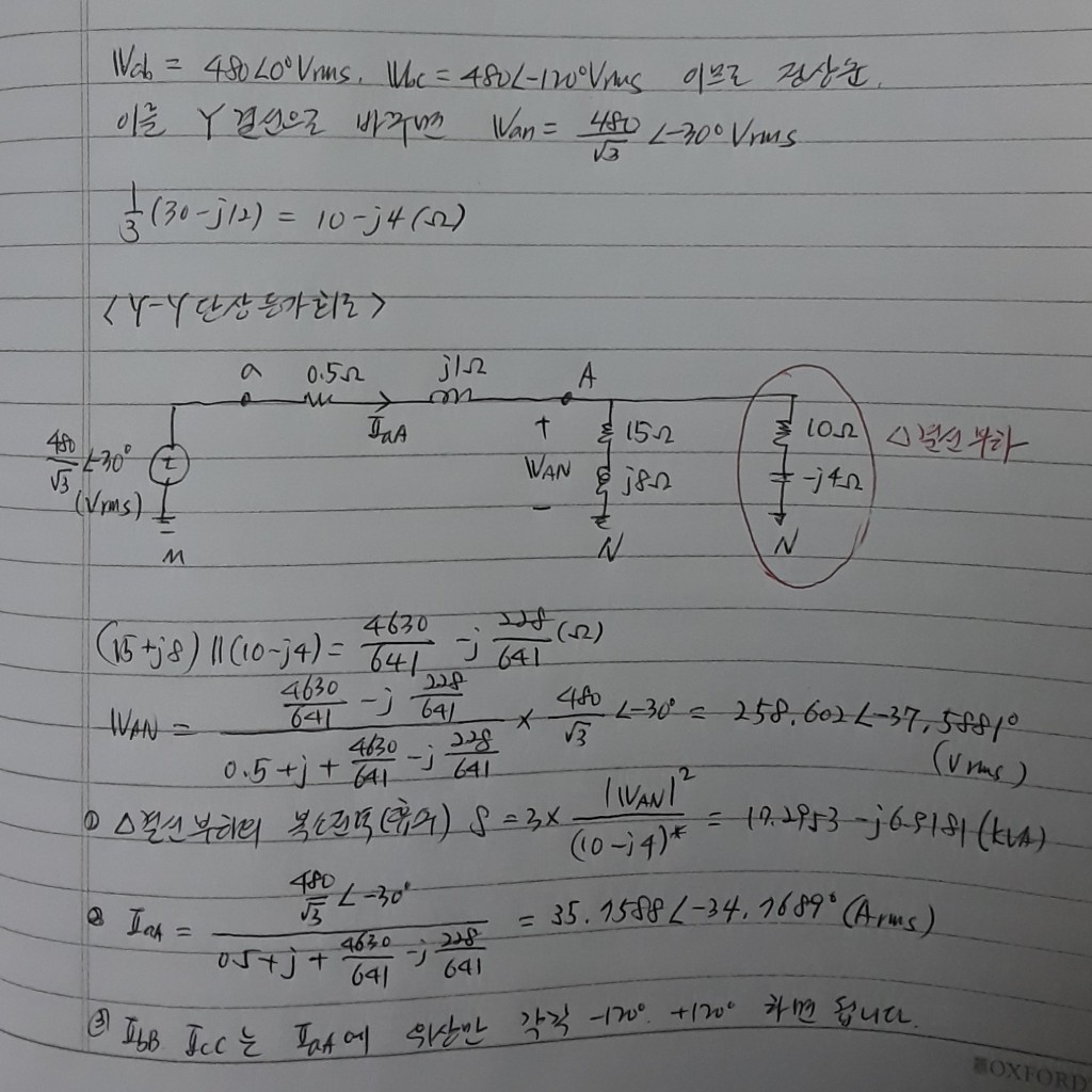 삼상회로는 기본적으로 모든 부하와 전원을 Y-Y 결선으로 바꾼 다음 단상회로만 취하여 해석합니다.